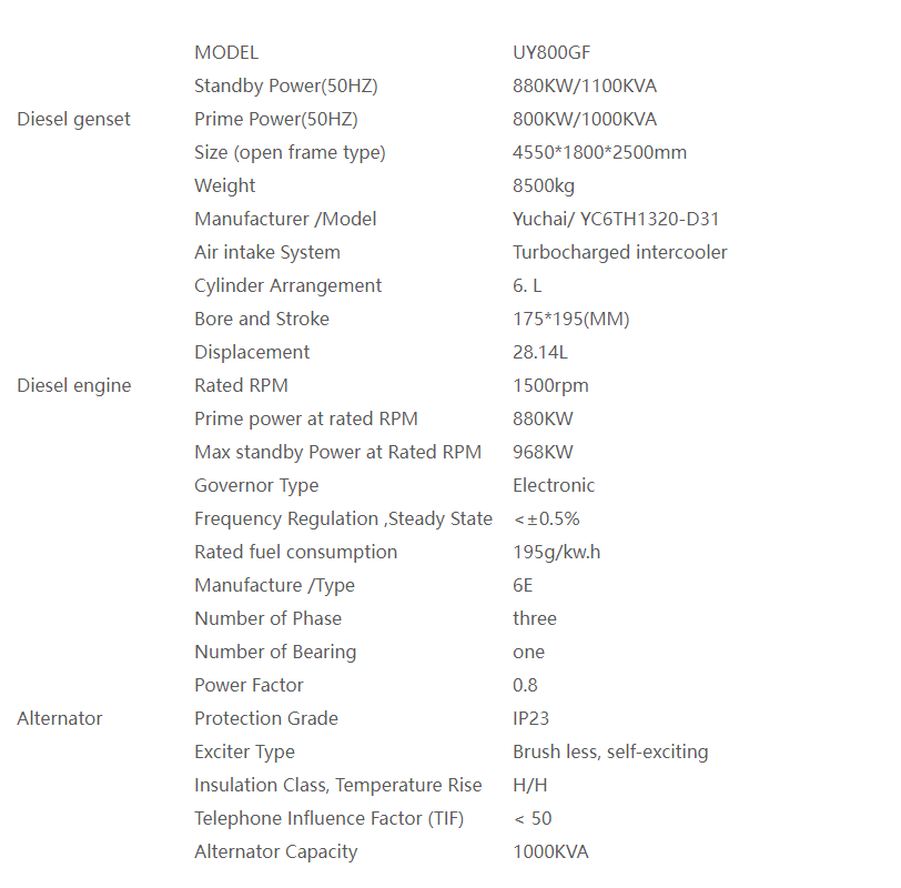 800KW Yuchai diesel generator 1000KVA Yuchai diesel generator specification