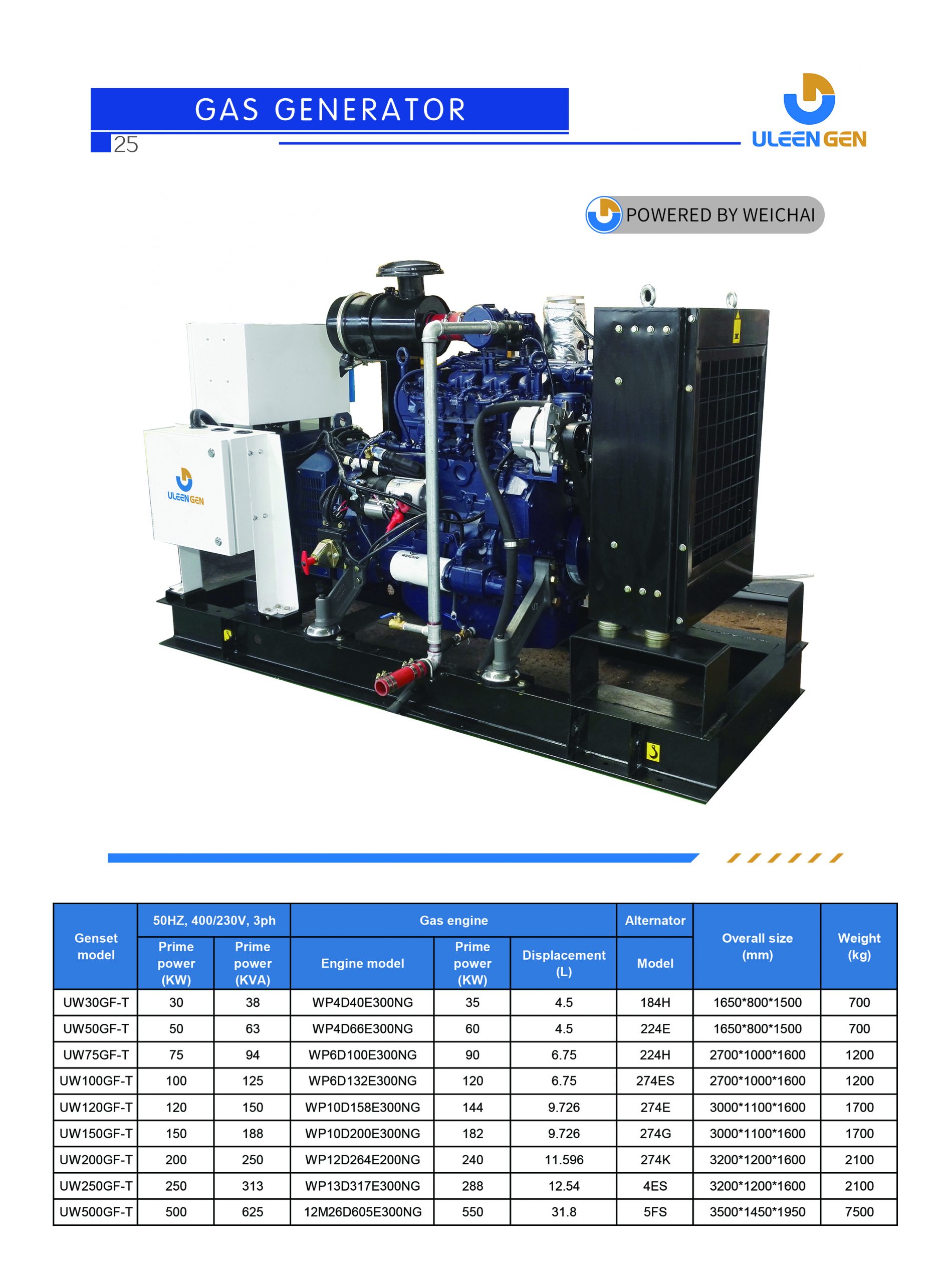 Gas heat value≥5500kcal/Nm3 (23MJ/Nm3 ). Gen set output power will increase as the gas heat value increase, if use low heat value gas for fuel (Heat value<5500kcal/Nm3, it will lower the power efficiency.