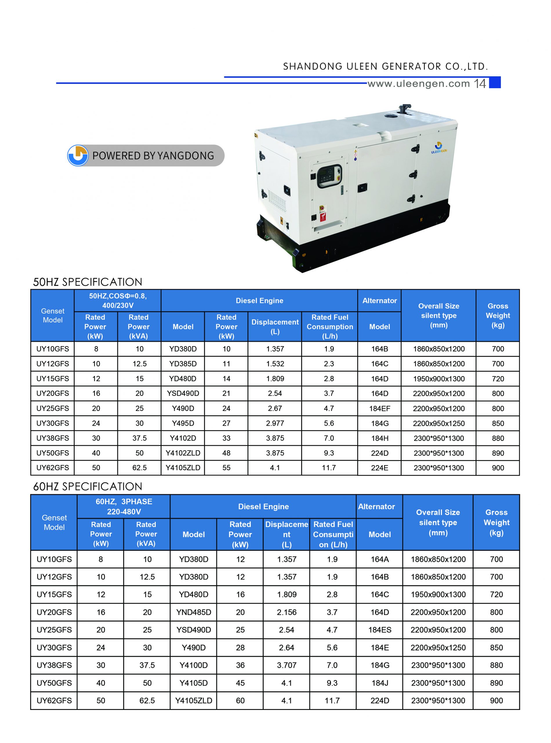 Brand-new Yangdong engine, speed 1500rpm/1800rpm, 4 stroke, water cooled